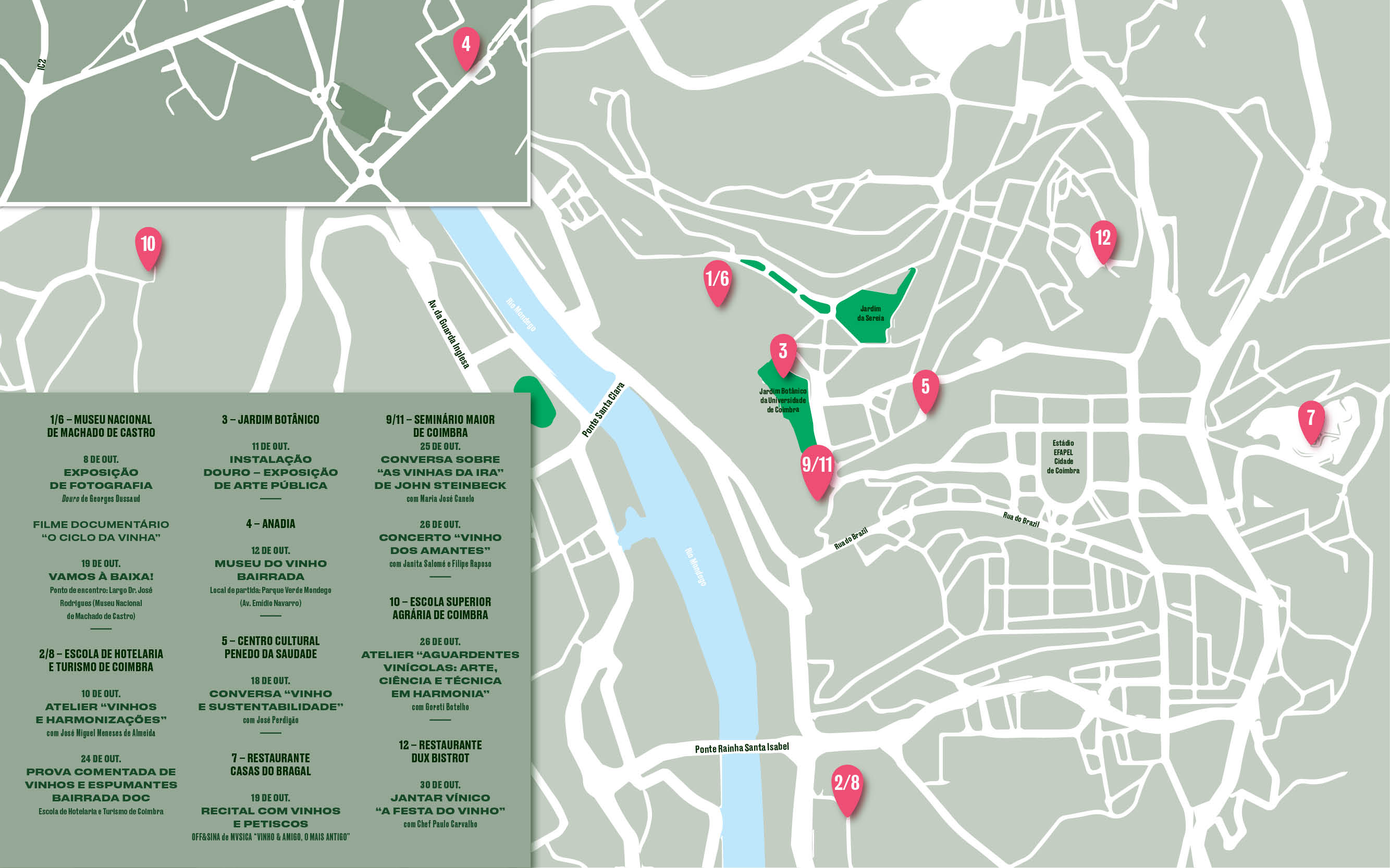 De sublinhar que é com grande satisfação que assinalamos novas parcerias institucionais, nomeadamente com a Universidade de Coimbra, Instituto Politécnico de Coimbra, Escola de Hotelaria e Turismo de Coimbra e Seminário Maior de Coimbra, enriquecendo deste modo a programação no seu todo e abrindo portas a uma fruição mais alargada e diferenciada do espaço público e privado. Sem esquecer a importância das colaborações com particulares, de que é exemplo o percurso citadino “Vamos à Baixa!”, no qual conheceremos em detalhe quatro lojas que apostam numa oferta comercial inovadora, com admirável empreendedorismo, risco e ousadia.