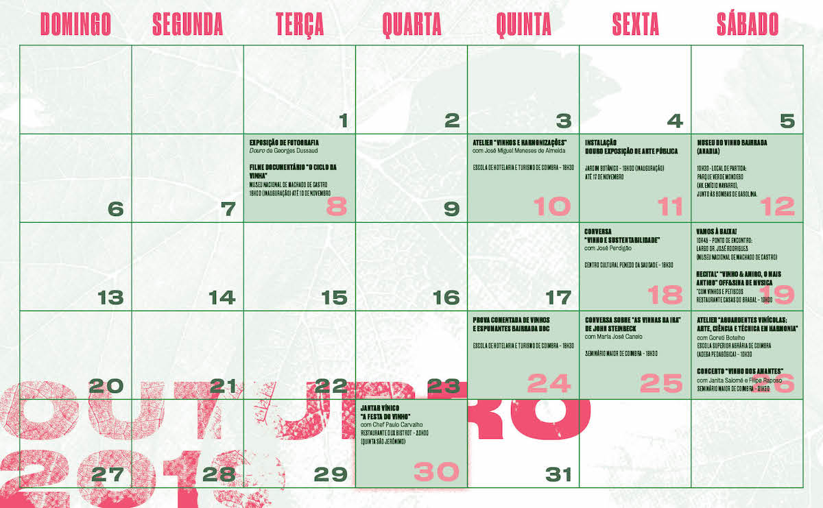 2018 marcou a estreia do projecto “O Mundo do Vinho”, ocupando vários espaços e equipamentos da cidade de Coimbra, contemplando ainda uma visita à região da Bairrada. Outubro foi a escolha natural para se falar de vinho, a partir de diferentes abordagens, todas elas enaltecendo a cultura, a tradição, a emoção e o prazer a ele associados. Uma prova que deixou boas memórias a todos aqueles que participaram na dezena de actividades então programada, de tal modo que estamos de regresso, com mais alento e energia, para a 2ª edição de “O Mundo do Vinho”. Música, Cinema, Literatura, Fotografia, Enologia e Enoturismo preenchem a programação que tem o vinho como previsível pretexto.